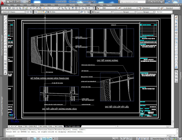 Đây là hình ảnh cho phần mà tôi đã chỉnh sửa lại, do các nét vẽ khi xuất từ sketchup ra file autocad bị rời rạc so với nhau nên tôi sẽ block phần hình này lại để tiện sử dụng khi trình bày. Sau khi sử dụng các khung view MV với các tỷ lệ khác nhau, các text ghi chú, các phần chi tiết lớn, chi tiết nhỏ tôi được phần bản vẽ như phía dưới.